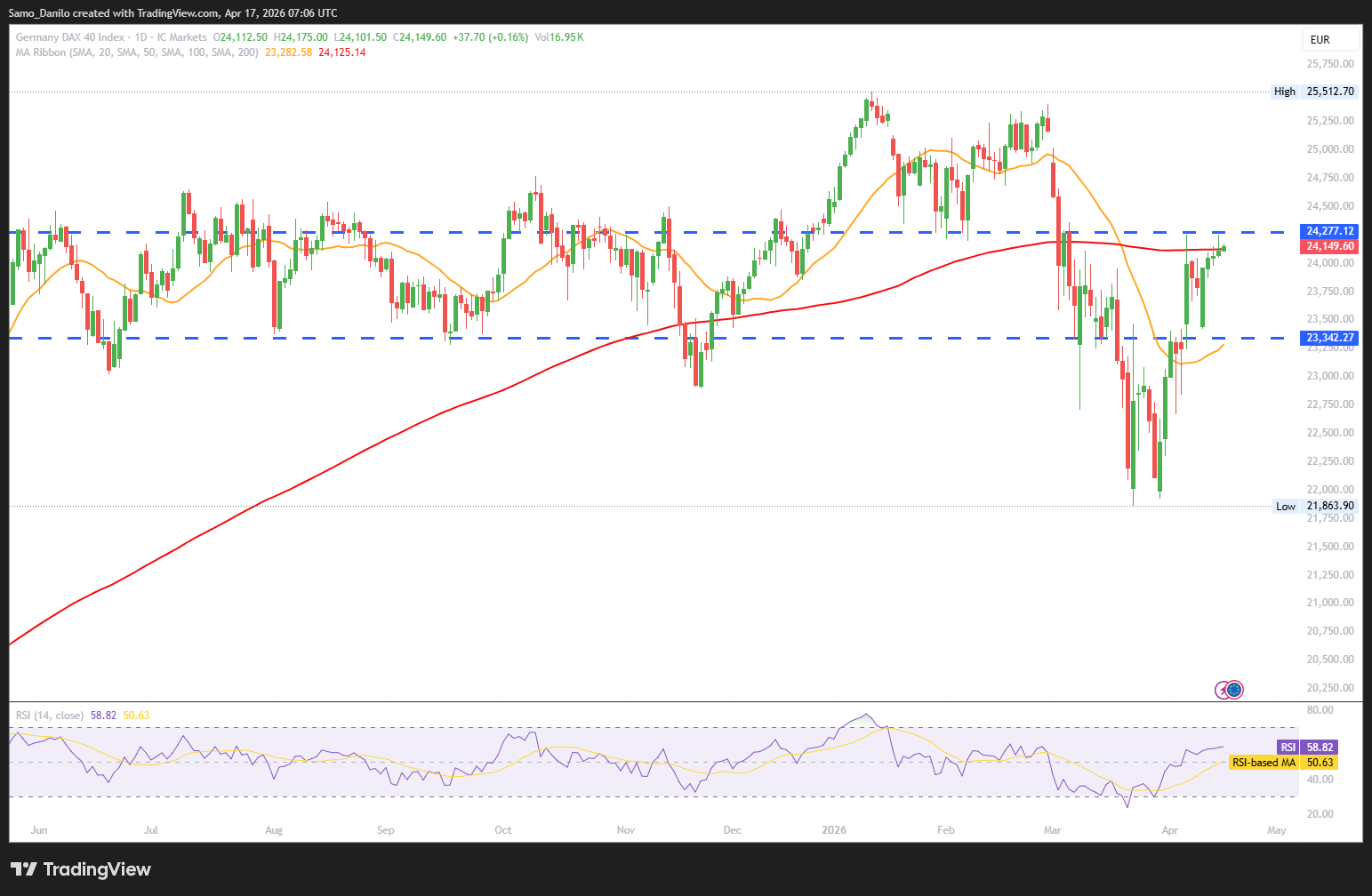- DAX 40 Price: The DAX 40 is trading slightly higher around 24,130 points, indicating modest upward movement. This suggests a cautious market tone, with investors balancing supportive factors against growing macroeconomic concerns.
