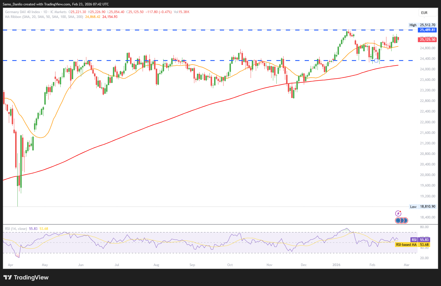 Closing statement: DAX remains range-bound near multi-week highs, supported by resilient domestic indicators and easing trade tensions, though global growth concerns, particularly from the US, may continue to cap strong upward momentum in the near term.